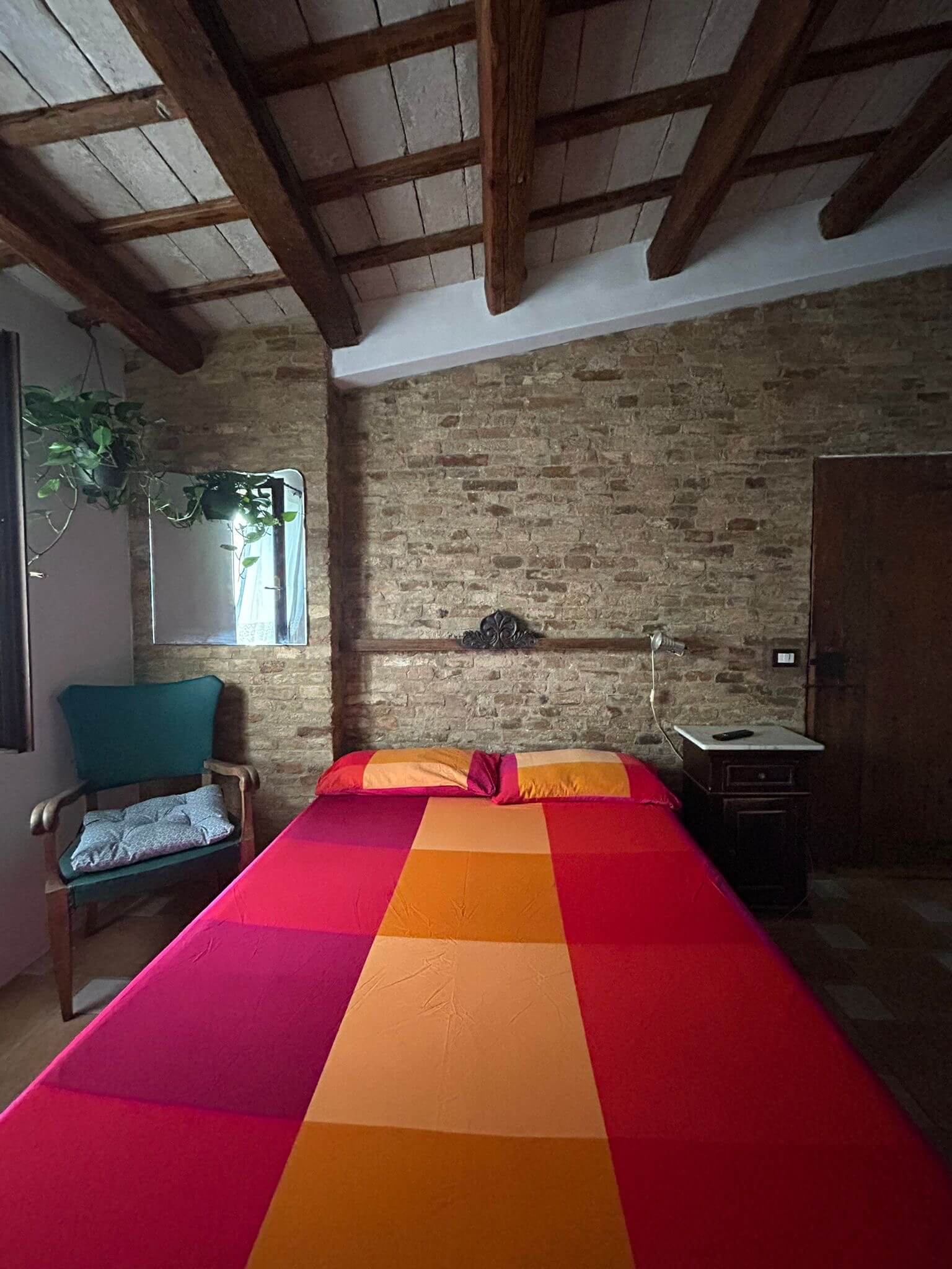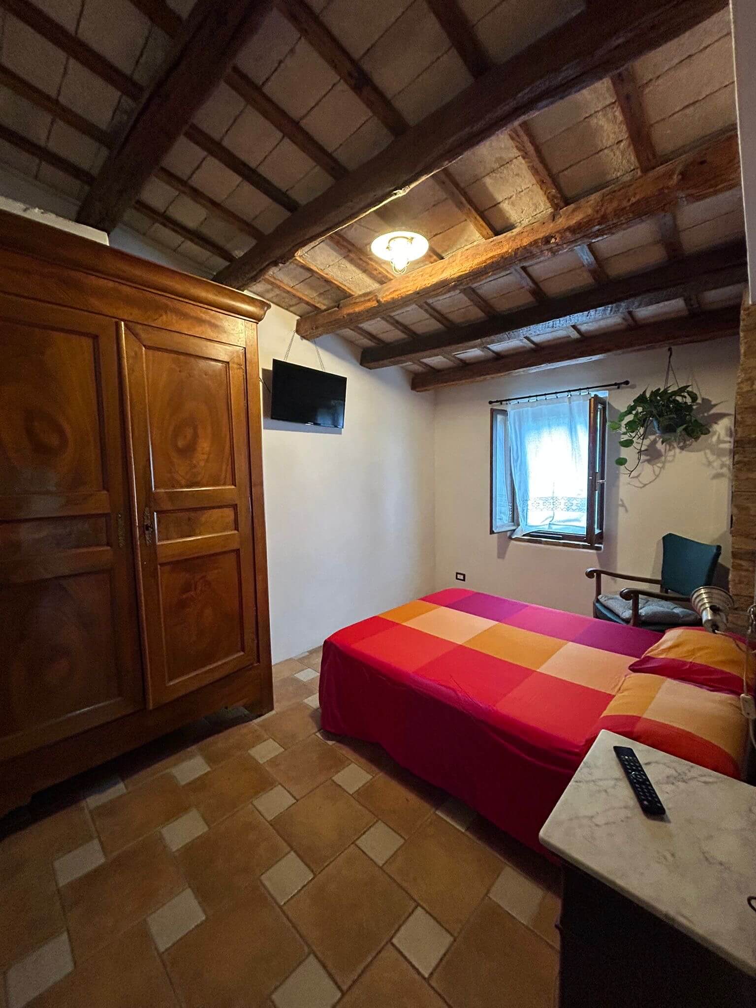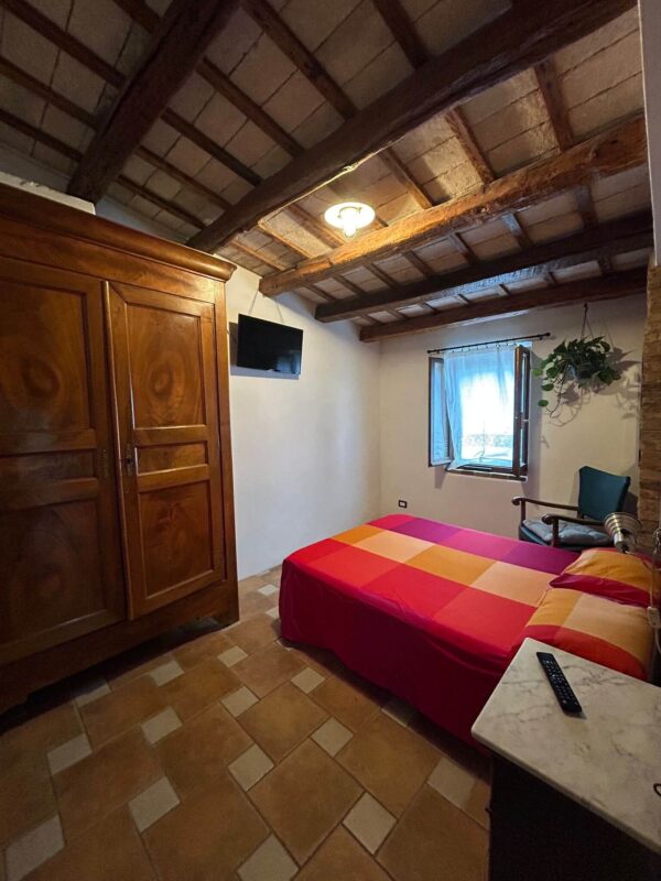 L’affittacamere Il Pettirosso si trova all’interno delle mura del suggestivo castello di Castel d’Emilio, nel borgo storico di Agugliano, in provincia di Ancona. La camera è accogliente e arredata in autentico stile rustico: travi in legno originali, pavimento in cotto, letto matrimoniale confortevole, armadio in legno massello e finestra con vista sulla quiete del borgo.