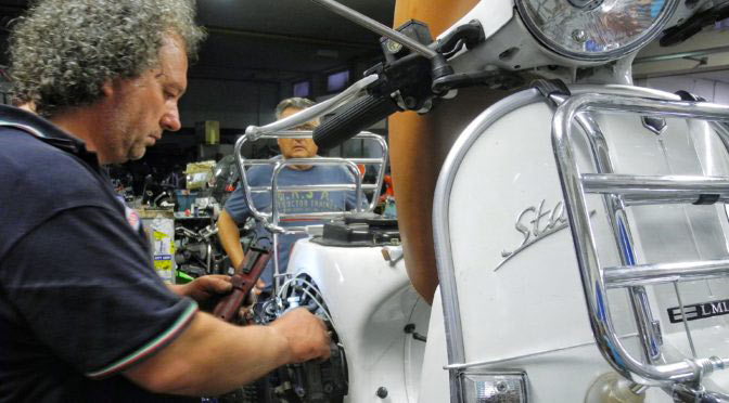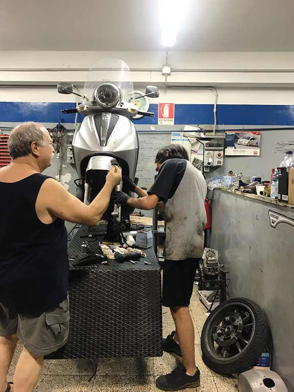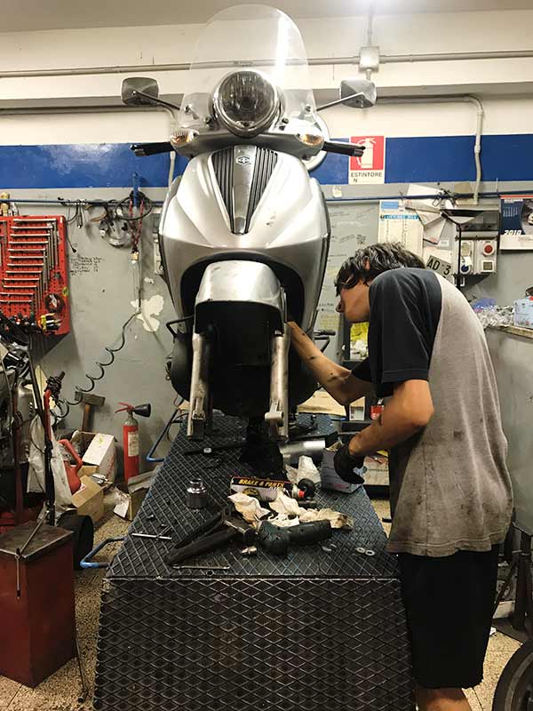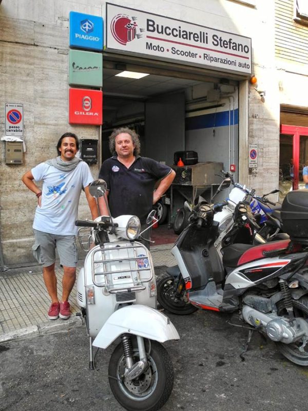 Quando si tratta di partire con una vespa e di percorrere tanti chilometri la prima persona in cui cerchi conforto e fiducia è il meccanico. Per questo un giorno sono andato in officina da Stefano ad illustrargli il progetto. Non avevo ancora finito di parlare che già aveva acceso il motore, tolto i cofani laterali e iniziato a lavorare per la messa a punto. (Fonte)