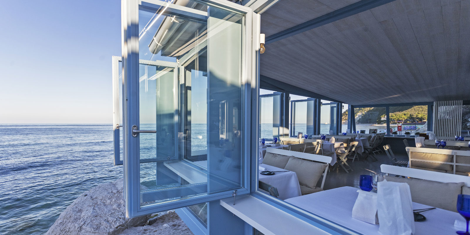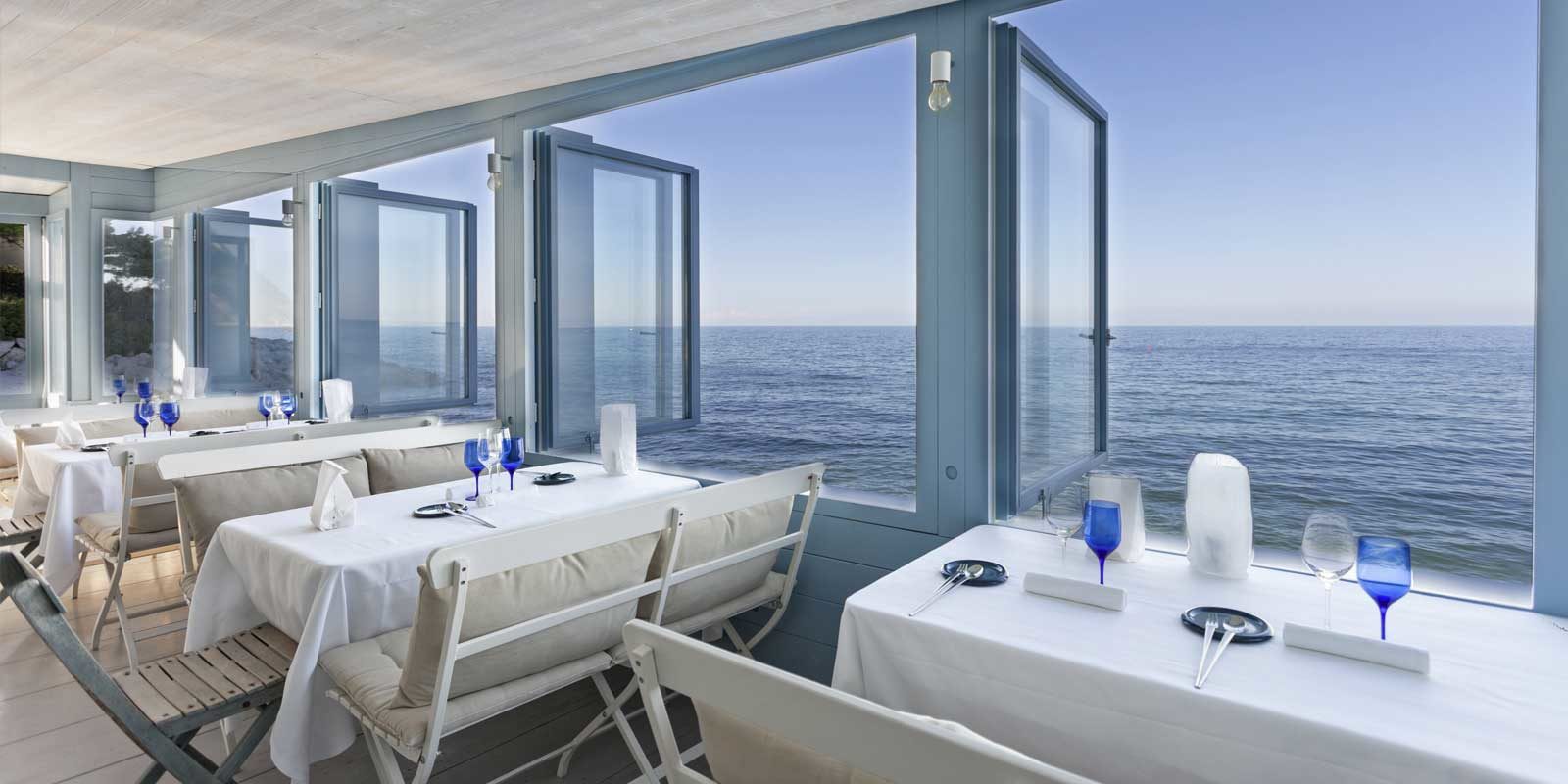 Ricette d'autore a base di pesce in un ristorante romantico con arredi chiari e finestre a ridosso sul mare.