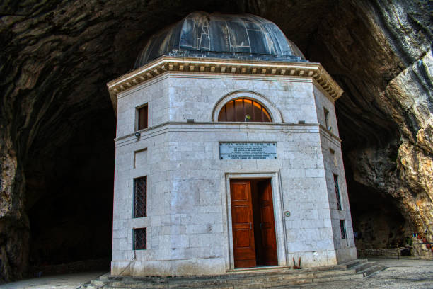 Il Tempio di Valadier sorge in una grotta naturale ed è stato commissionato da Papa Leone XII nel 1828 all’architetto Giuseppe Valadier. Costruito in stile neoclassico, presenta una struttura ottagonale in marmo bianco che crea un contrasto spettacolare con la roccia circostante.